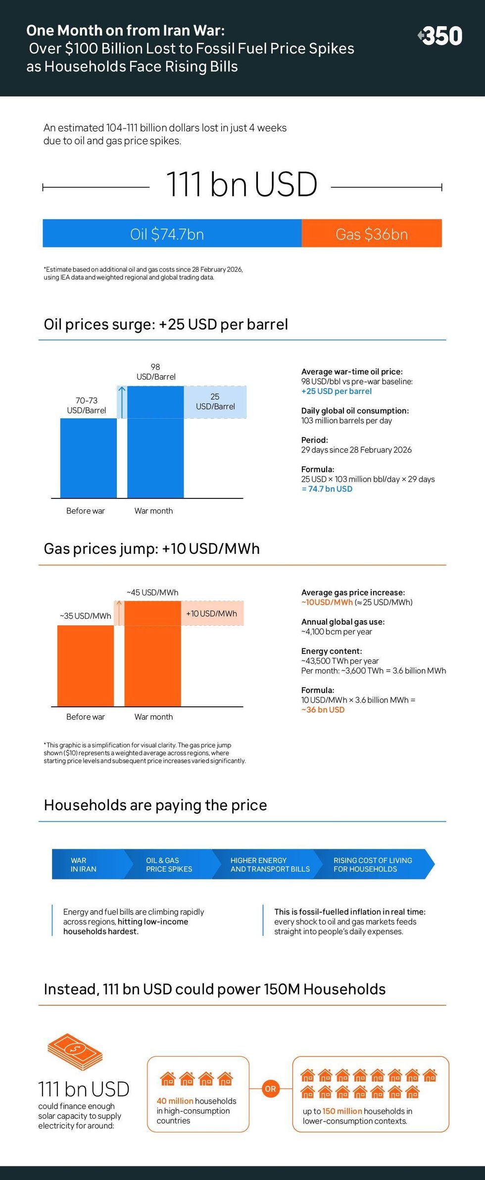The 350.org analysis calculates losses from price spikes using weighted oil and gas price averages over the first month of the war, combined with global consumption levels and adjustments for uncertainty, such as reduced demand and rationing in response to rising prices.