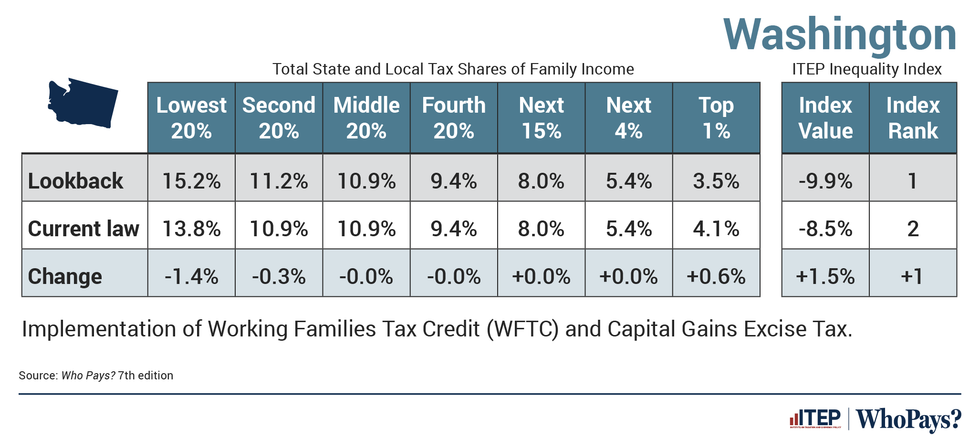 Washington had long been home to the most regressive tax code in the nation due to its lack of an income tax and heavy reliance on sales and excise taxes. But changes made by state lawmakers in the past few years helped Washington shed that dubious distinction and rise one spot on ITEP’s Tax Inequality Index. The state now has the No. 2 most regressive tax system in the country. The small but important move up the rankings was driven by two policy changes: the creation of the state’s Working Families Tax Credit, which functions much like an Earned Income Tax Credit, and the creation of a new Capital Gains Excise Tax.