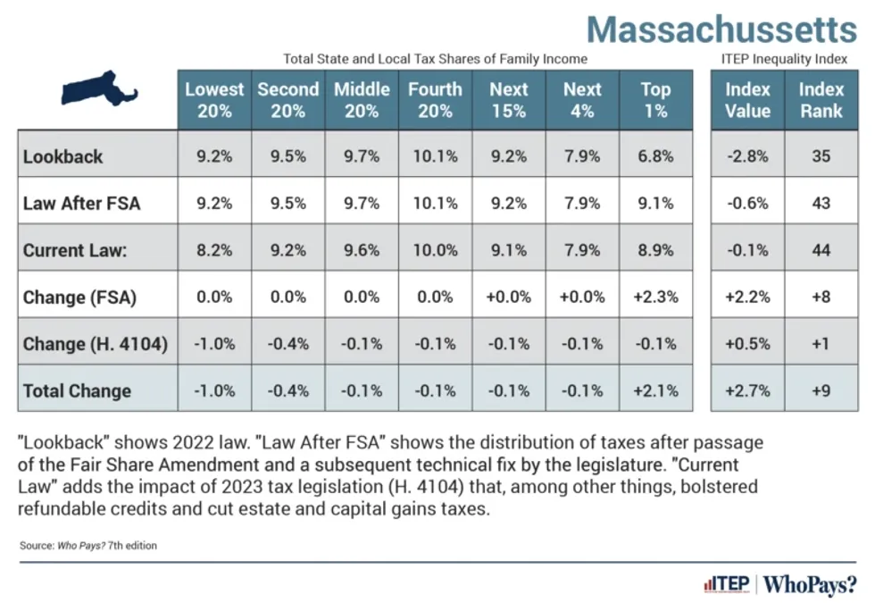 Tax changes made in Massachusetts since 2022 led the state to jump nine spots in ITEP’s Tax Inequality Index to the No. 8 least regressive tax system. These policy changes included 2022 voter approval of the Fair Share Amendment, which created a 4% surcharge on income over $1 million to fund education and transportation projects, as well as legislation in 2023 that among other things, bolstered the state’s refundable credits (which improved equity) and cut estate and capital gains taxes (which detracted from equity but not enough to erase the impact of the other equity-increasing policies). Without all these changes, Massachusetts would currently have the 35th most regressive tax code in the country.