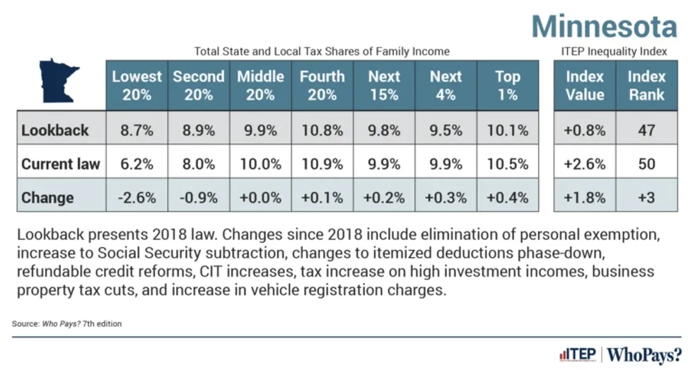 Minnesota was already a national leader on tax fairness. But tax changes made in Minnesota since 2018 led the state to rise three spots in ITEP’s Tax Inequality Index to the No. 2 least regressive tax code, behind only Washington, D.C. These policy changes included the creation of a new, robust Child Tax Credit coupled with tax increases on high investment incomes and some corporations. Without these and other changes made since 2018, Minnesota would currently have the No. 5 least regressive tax system in the country.
