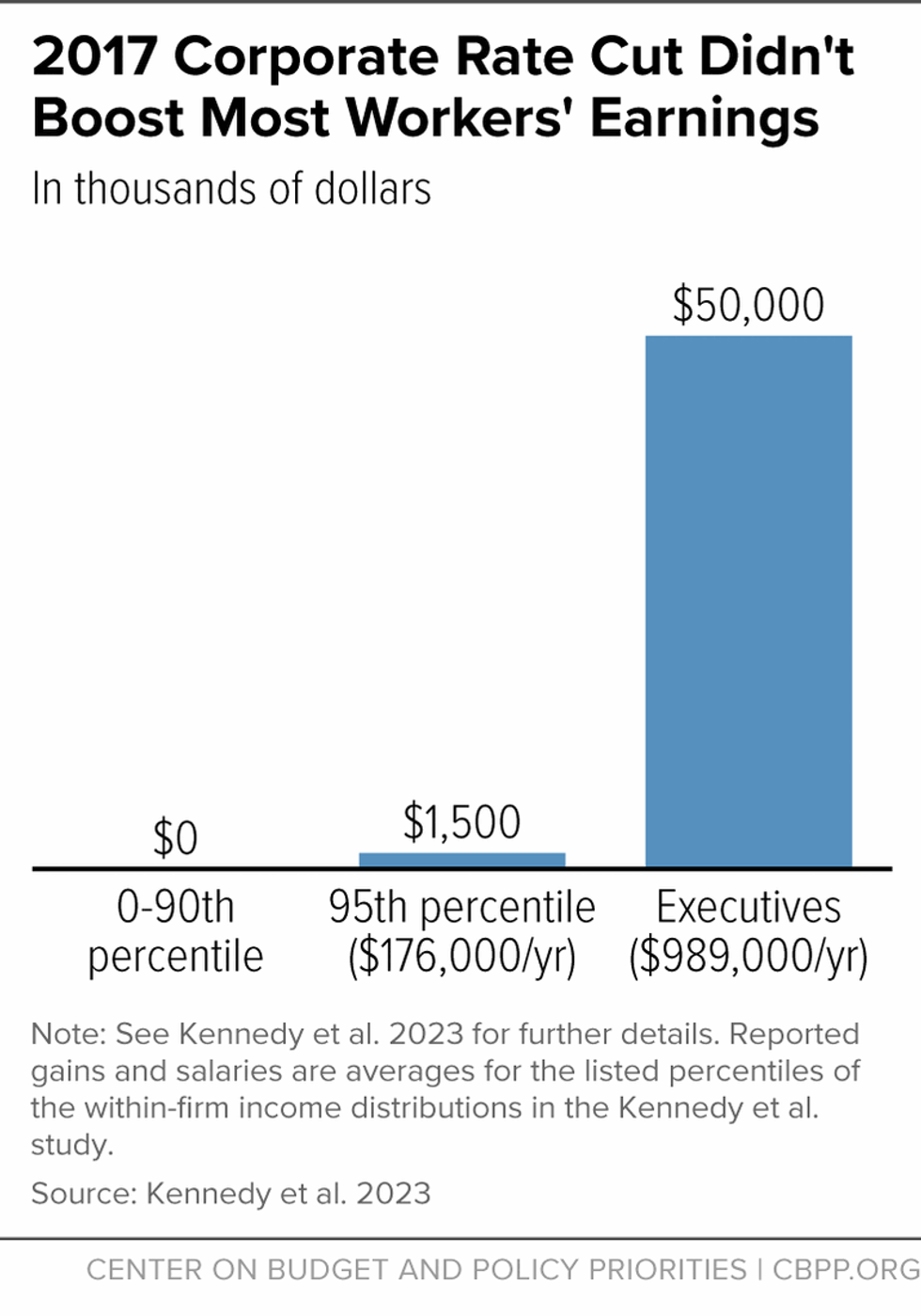 Another new study by a team of economists from Harvard, Princeton, the University of Chicago, and the Treasury Department estimates that the corporate tax cuts — including the cut in the corporate tax rate, full expensing for capital investments, and international tax changes — led to nearly dollar-for-dollar revenue losses, even after accounting for increases in economic activity due to those cuts, contrary to proponents’ promises that the cuts would pay for themselves.[40] The study does not examine how the corporate rate cut impacted earnings for workers with low and moderate incomes. It forecasts that in the long run, the corporate tax cuts could on average increase wages by about $750 per worker, an “order of magnitude below” proponents’ predictions;[41] the separate paper by JCT and Federal Reserve economists finds that wage and salary gains accrued only for workers in the top 10 percent of their firm’s earnings distribution.