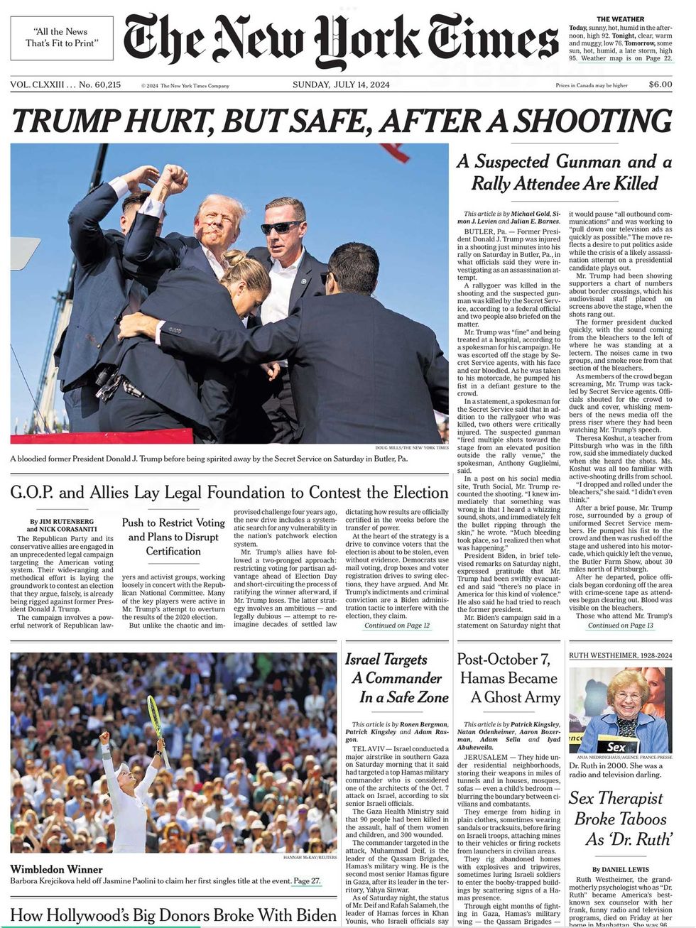 I am writing this less than 24 hours after the shooting in Butler, Pennsylvania. Trump had the good sense to say that “nothing is known at this time about the shooter,” as so much will be known soon. But the two sides have already staked their ground as if they knew as much about this as we do about Hinkley or Moore or Bremer or Sirhan or Oswald or Zangara or Schrank or… (So many names.)