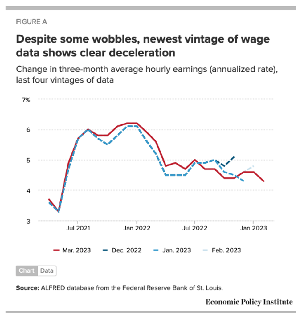 However, nominal wage growth—what many have called a “supercore” measure of inflation—has consistently cooled over the course of 2022 and early 2023. Occasionally a single month of data has shown an uptick of wage growth and concerns are raised, but new data then show continued cooling. Figure A below shows annualized rates of wage growth for the latest three months relative to the prior three months. It shows these rates of wage growth for the initial releases of this data from December 2022 to March 2023. While wage growth blipped up in the December 2022 and February 2023 reports, the most recent report shows a clear pattern of consistent nominal wage deceleration.