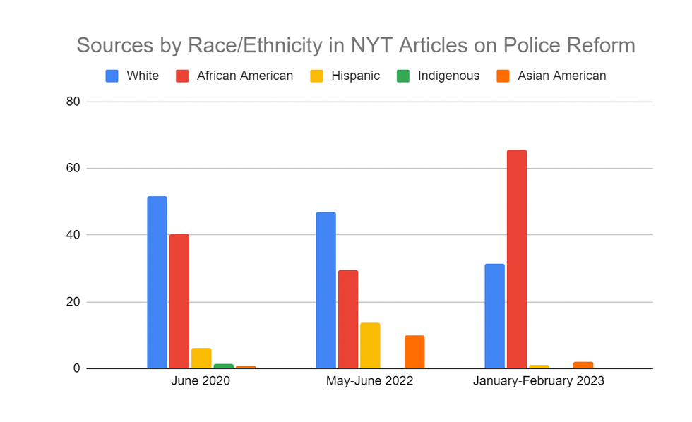 The shift to a more diverse set of sources on the issue at the Times, during this one-month time period, is commendable. While the circumstances and location of Tyre Nichols’ killing offered strong opportunities to bring in more Black sources, the Times could easily have fallen back on its usual reliance on official sources, as it did in 2020 and 2022. Now it’s incumbent upon the Times to apply that more diverse and critical approach across all policing stories—not only when similarly high-profile police killings rock the country.