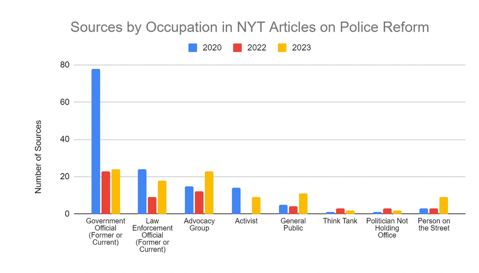 Eliminating passing mentions and opinion pieces, we examined New York Times news articles centrally about policing policy or reform. We found 10 articles (with 58 sources) meeting our criteria between May 1 and June 30, 2022, and 16 articles (111 sources) between January 13 and February 10, 2023 (two weeks before and after the main day of the Tyre Nichols protests). Because the Times covered the issue so extensively in 2020, we took a random sample of 25 articles (142 sources) meeting our criteria from June 2020.