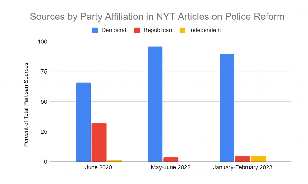 This near-total absence of Republicans from the conversation reflects in part the switch in power at the national level; Republicans controlled both the White House and Senate in 2020, and both had flipped to the Democrats by 2022. It also reflects the reality that the massive nature of the protests forced Republicans to address the issue of police reform in 2020, but they were no longer talking about it much in 2022—nor were outlets like the New York Times forcing them to.