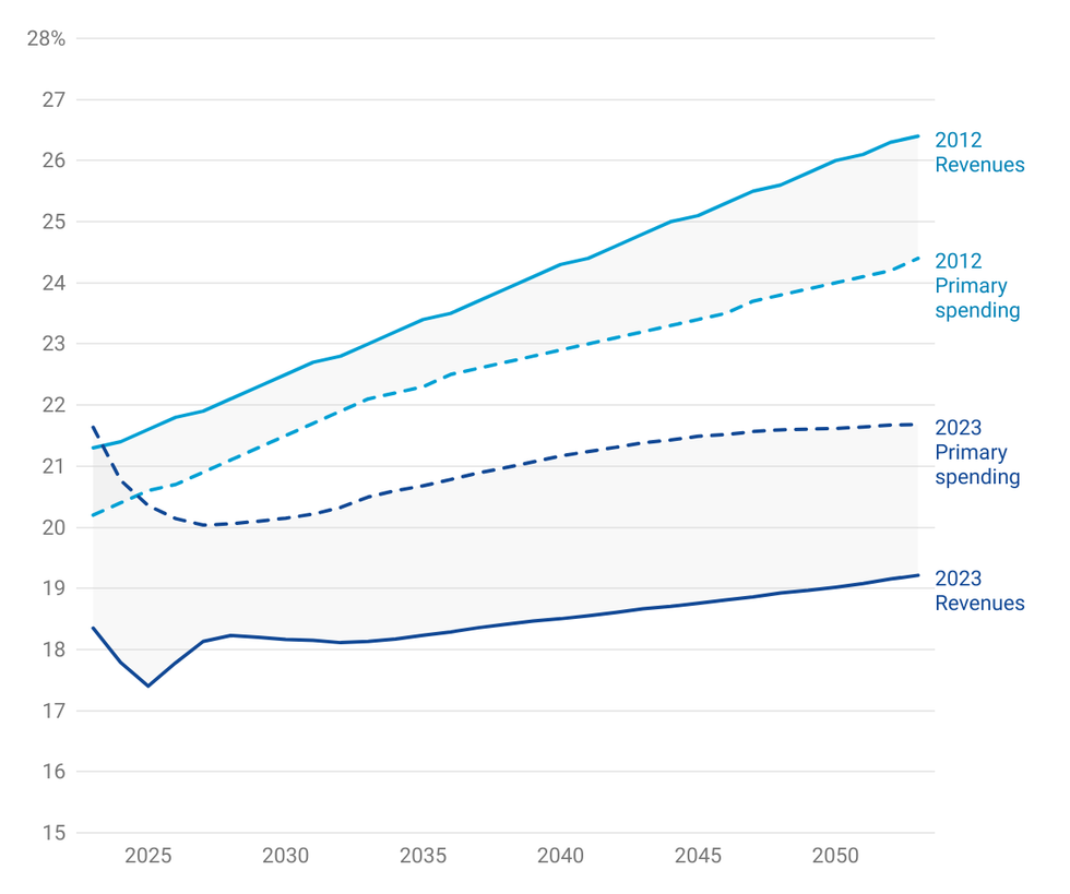 Both revenues and spending are lower than earlier projections, meaning low revenues are responsible for persistent primary deficits