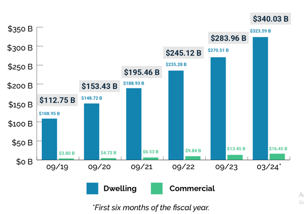 This trend of more and more policyholders moving from the private homeowners insurance market to state-backed insurance of “last resort”—called Fair Access to Insurance Requirements (FAIR) Plans—is also happening in other highly exposed states like California, Louisiana, and North Carolina. In California, the FAIR plan’s exposure to loss is getting increasingly unsustainable, putting it at risk of insolvency. Data from CA FAIR Plan show that “as of March 2024 (partial fiscal year), the FAIR Plan’s total exposure is $340 billion, reflecting a 20% year-over-year increase.” (See chart below)