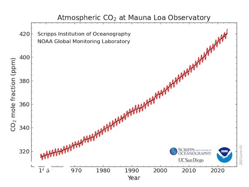 The Scripps Institution of Oceanography at the University of California San Diego partnered with NOAA, taking its own measurements at Mauna Loa, and found virtually the same concentrations of CO2 and the same huge leap since last year this time.