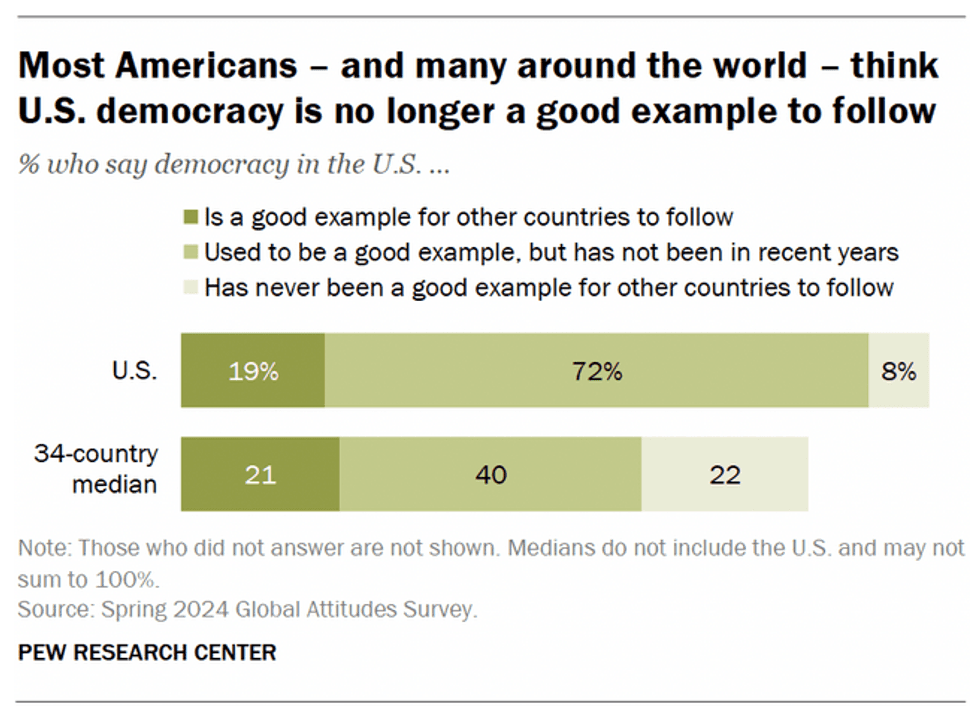 Polling bears that out. A July 2024 Pew Research survey found that an overwhelming 72 percent of Americans don’t believe the United States is a good example of democracy. Democrats were slightly more likely to believe in American democracy than Republicans, but they’re hardly starry-eyed. Less than one-fourth of Democrats think we have an exemplary democracy.