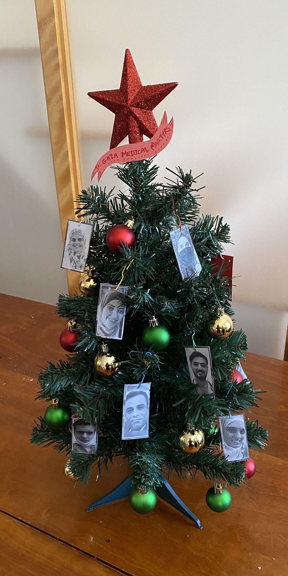 Along with our big banner, we carry flyers for hospital workers encouraging them to reach out to our group to organize with us in solidarity with their colleagues 8,000 miles away. And finally, we have a small Christmas tree adorned with multi-colored balls, and unusual ornaments that, upon close inspection, prove to be photographs of healthcare workers martyred by Israel during its 14-month and counting genocide of the Palestinian people of the Gaza Strip.