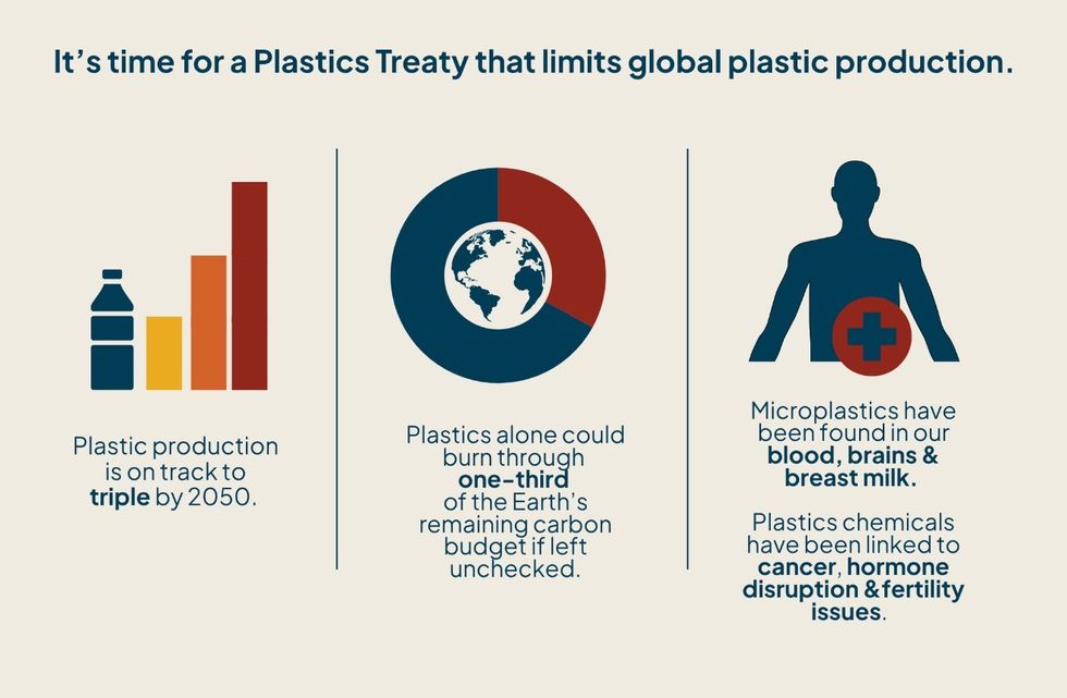 We’re headed to Geneva with our hearts and minds set on a treaty that caps and controls plastic production, addresses the toxic chemicals used to make plastics, ensures supply chain transparency, and delivers the financial mechanisms needed to stop plastic pollution.