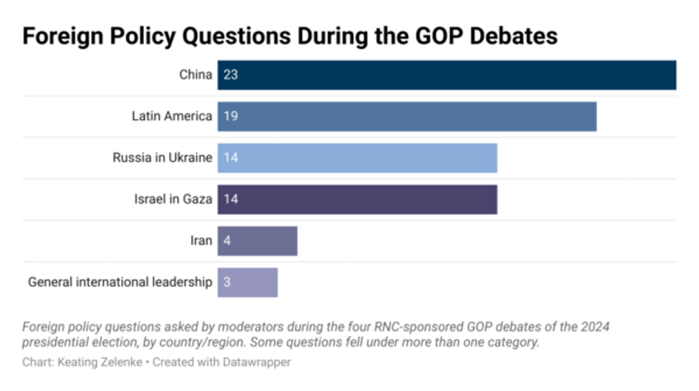 The foreign policy-related questions in the first two debates were dominated by three topics: how to “deter” China, policy towards Latin America concerning both drugs and migration, and the continuation of aid to Ukraine. During the two debates following Hamas’ October 7 attack, questions about each candidate’s approach to Israel’s assault on Gaza also became prominent.