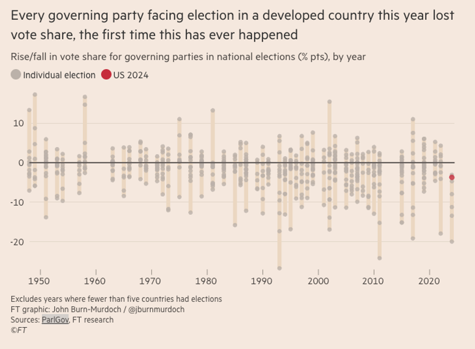 On the surface, it’s rather convincing. Burn-Murdoch’s piece included a chart, which has been widely circulated, displaying research from ParlGov stating that all incumbent parties in developed countries (though the text of his piece says “major countries”) have lost vote share in 2024 national elections, a previously unseen phenomenon.