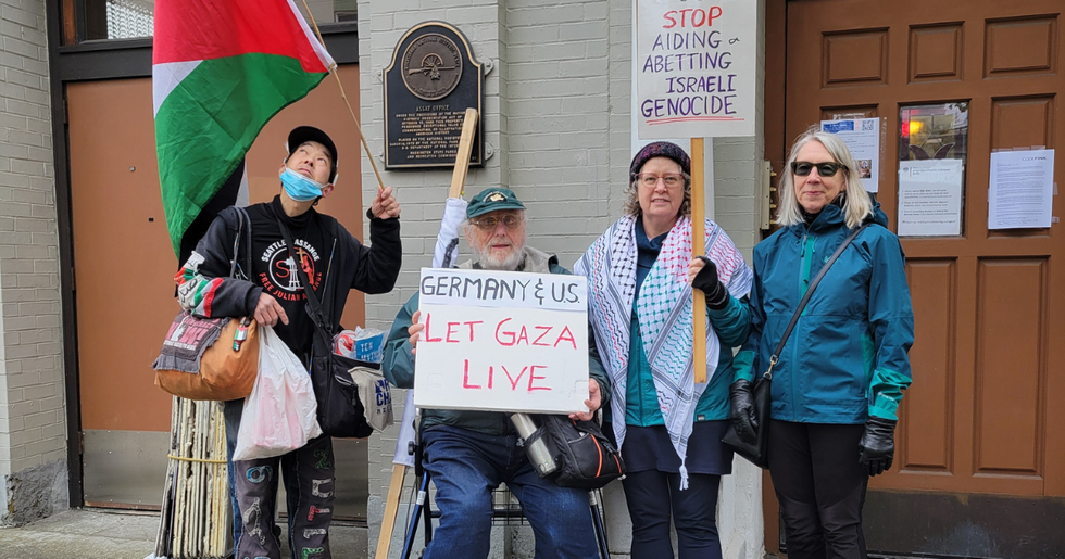 In Seattle, a contingent delivered the CODEPINK letter to the honorary consulate, where a staffer welcomed antiwar activists into the office, only to have the Honorary Consul General Uli Fischer,, formerly in the German Air Force and a retired Boeing employee, refuse to meet with them. Nevertheless, participants said they could see through a crack in the door that the Consul General was reading the letter also signed by Veterans for Peace and the Seattle Antiwar Coalition.