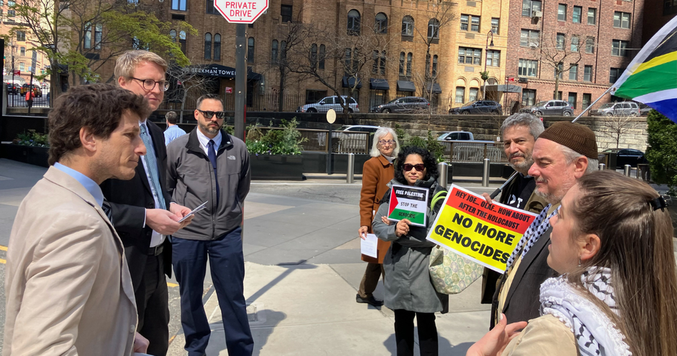 Later the Israel defender returned with three menacing others spewing four-letter words, itching for a fight and videotaping protesters.