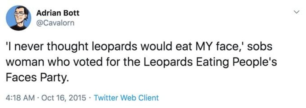 In 2015, writer Adrian Bott famously tweeted: “‘I never thought leopards would eat MY face,’ sobs woman who voted for the Leopards Eating People’s Faces Party.” This went viral, coining the phrase, “Leopards ate my face.” It’s so tempting to mock people who act against their own interests such as Trump voters.