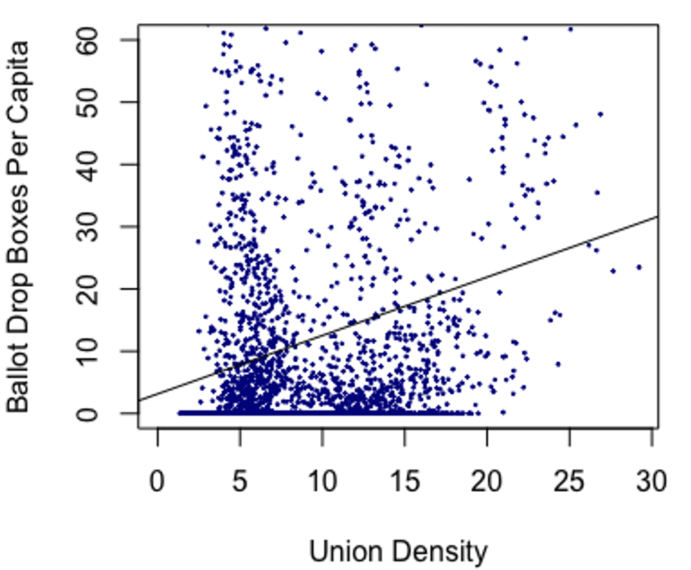 Figure 1: Relationship between county-level union density and ballot drop boxes per capita during the 2022 midterm elections.