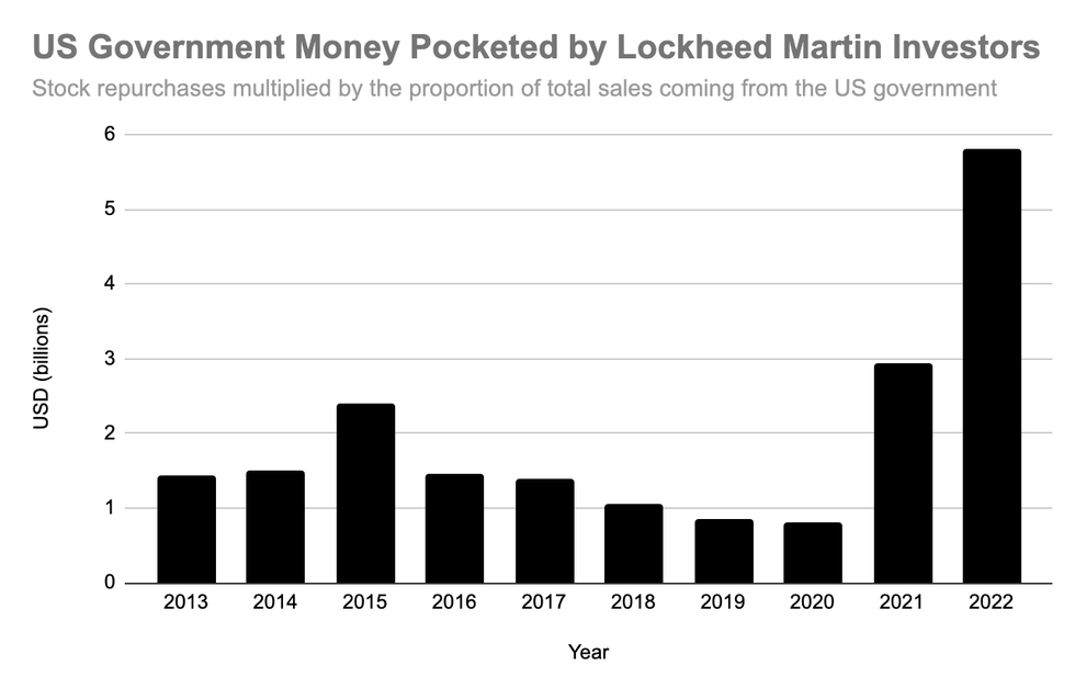 If the military contractor’s stock buybacks come proportionately from the different revenue streams of the company, U.S. taxpayers underwrote $5.8 billion in Lockheed buybacks in 2022.