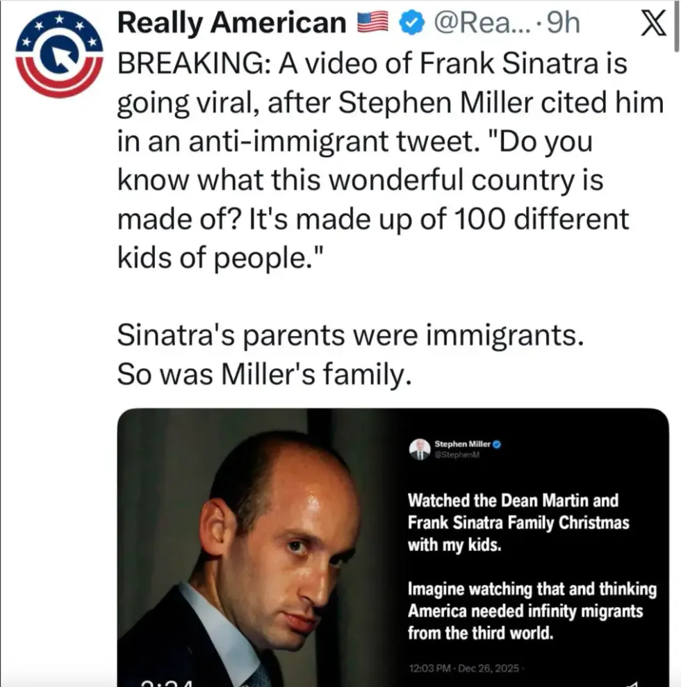 Apparently Miller spent Christmas day watching a 1967 holiday special called “Christmas with The Martins and The Sinatras” and, being the miserable misanthrope that he is, the show—featuring Dean Martin and Frank Sinatra, two very famous children of first-generation Italian Americans—prompted him to wax nostalgic about a world in which America was Great and there was no mass immigration. Everything that Miller says or does deserves outrage, and his X post was no exception. One form the justified outrage has taken recently crossed my Facebook feed: