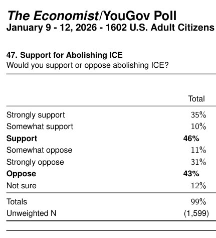 In perfect form, this morning the centrist advocacy group Third Way released a memo warning Democrats not to call for dismantling ICE, arguing that “politically, it is lethal.” Their evidence includes a focus group they conducted in October, which…is dumb. ICE’s execution of Renee Nicole Good has broken through—69 percent of Americans report having seen video of the shooting. This has clearly impacted public opinion in a way that makes information from months ago significantly irrelevant.