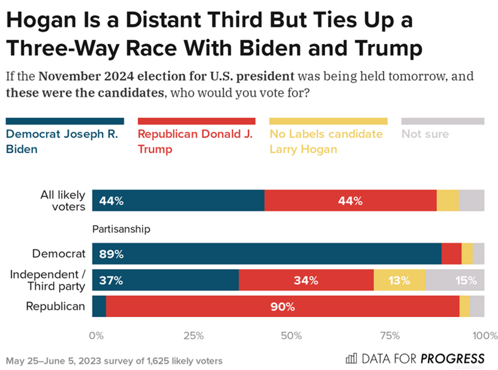 In new polling on the 2024 election, Data for Progress finds that these concerns are substantiated. The poll finds that while Joe Biden is ahead of Trump in a hypothetical head-to-head contest, the introduction of a No Labels candidate siphons votes away from Biden, leading to a Trump victory. Specifically, the poll tested voter support for a realistic contender for a No Labels ticket, Larry Hogan, popular former governor of Maryland, as well as an unnamed moderate Independent candidate, a hypothetical candidate free from political baggage. We find that in addition to enabling a Trump victory, neither third-party candidate would be a viable contender, trailing either major candidate by nearly 30 points even in their best-case scenario.
