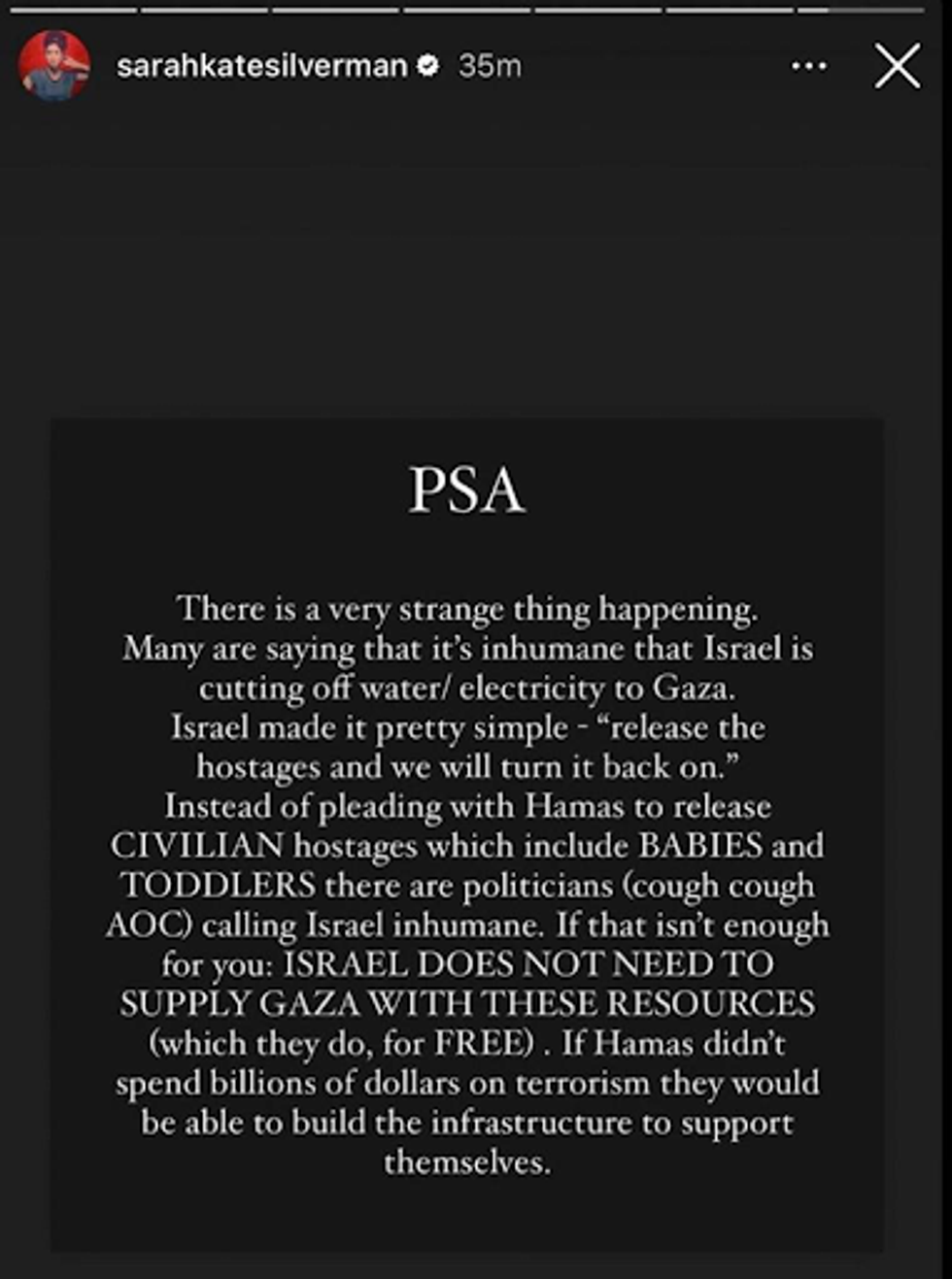 With these facts in mind, imagine how dangerous it is when prominent American celebrities, like comedian Sarah Silverman, post erroneous and callous statements such as the statement below to 2 million Instagram followers in support of Israel cutting off water to Gaza.