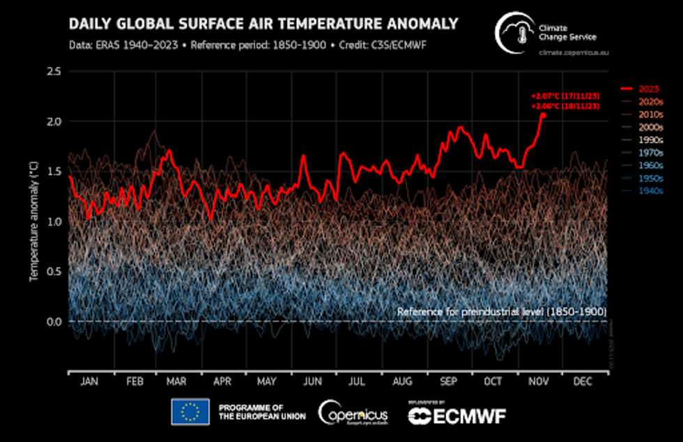 This year’s transition from La Niña into the warming El Niño phase gave us a glimpse of our future as we experienced record-breaking temperatures all over our planet. In 2023, around one-third of days exceeded 2.7°F (1.5°C) of global average warming compared to the 1850-1900 period. Avoiding global average warming of 2.7°F (1.5°C) was the aspirational 2050 goal of the Paris agreement, yet we have passed this threshold for much of 2023, admittedly due to the temporary El Niño period. As if this wasn’t terrifying enough, just a month after this news broke, global average temperatures exceeded historical levels by over 3.62°F (2°C), while the main Paris agreement goal was to limit global average temperature rise to 3.62°F (2°C). All this adds up to 2023 becoming the hottest year on record. Global temperature records only began in 1880, but the European Union’s Copernicus Climate Change Service is “virtually certain” that 2023 will be the hottest year in 125,000 years, more than half the history of modern humans.