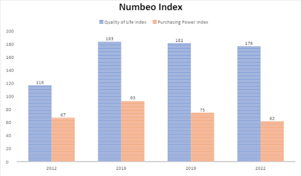The Numbeo Index is another useful guide to human well-being. Ostensibly set up to compare the cost of living globally, it can also illuminate quality of life. The data showed positive progress until 2016, but since then things have declined. Purchasing power also dipped from 2016 to 2019, and by 2022 all the gains made from 2012 to 2016 had been erased.