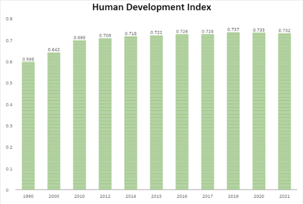 The United Nations Human Development Index (HDI) also saw a regression in 90% of countries in both 2020 and 2021—the latest data available. Many will attribute the decline to the pandemic, but, due to a lag from data collection to publication, much of the data for 2020 was collected in 2019, and the decline was underway before the pandemic hit.