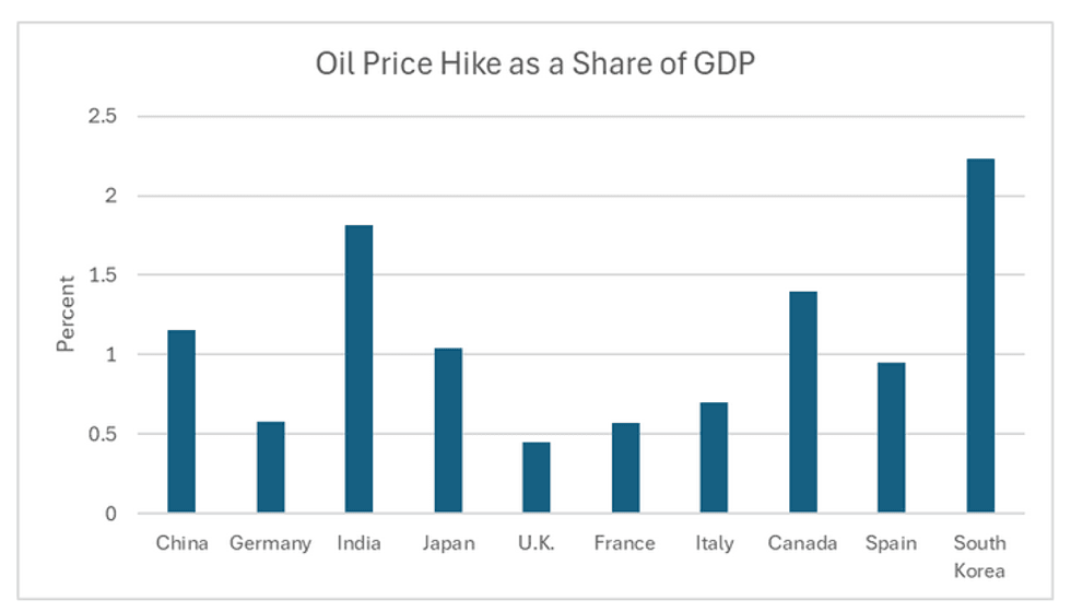 How bad the economic hit ends up being depends on both how long the war continues and the lasting damage it does to physical facilities. But a cheap and easy calculation is to look at how much the rise in oil prices costs countries relative to the size of their economies.