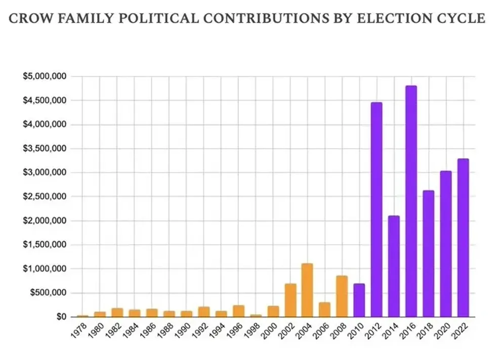 It was a remarkably successful investment for Crow, his family, and his billionaire buddies. Just his own family’s political contributions went from an average of a few hundred thousand dollars a year during the decade preceding 2010 to multiple millions every year after Thomas’ vote. Americans for Tax Fairness calculated it at an 862% increase just for the Crow family.