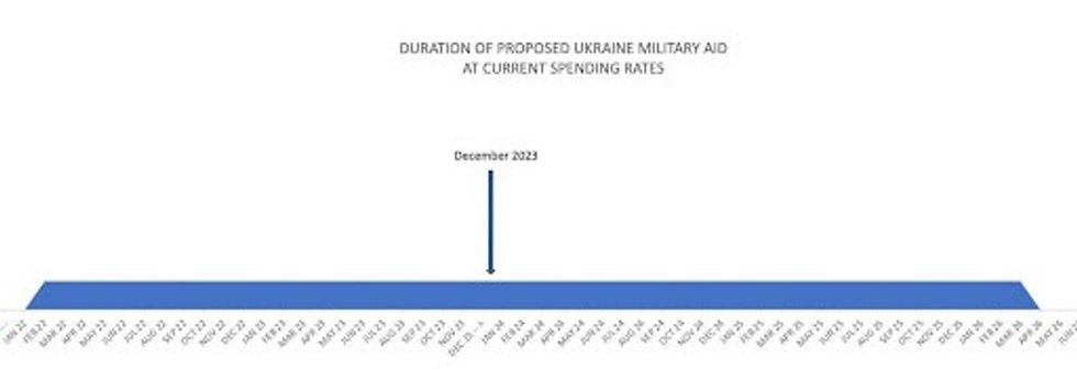 The State Department reports that the United States has given Ukraine $44.2 billion in military aid since Russia invaded at the end of February 2022. At the current pace of spending, the additional military aid requested by the White House would keep the Ukraine war going until sometime in mid-2026—that is, unless there is a plan to intensify the attacks, which would increase the risk of a nuclear conflict.