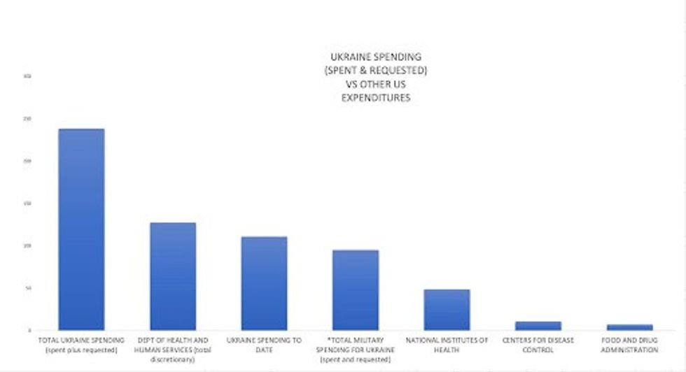 If this passes, the U.S. will have spent more in Ukraine than it spends to run the Department of Health and Human Services (excluding health insurance programs) for a year. Military-only spending for Ukraine will be greater than the annual budget of the National Institutes of Health, the Centers for Disease Control, and the Food and Drug Administration—combined.