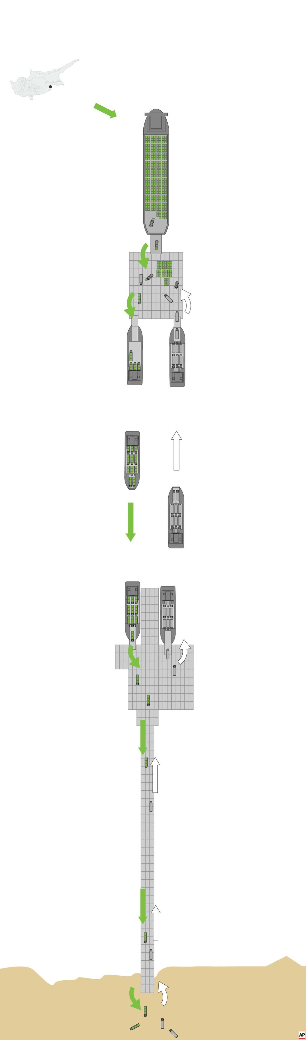 The inspection process involves Cypriot customs, Israeli teams, the U.S., and the United Nations Office for Project Services. The U.S. Agency for International Development has set up a coordination cell in Cyprus.
