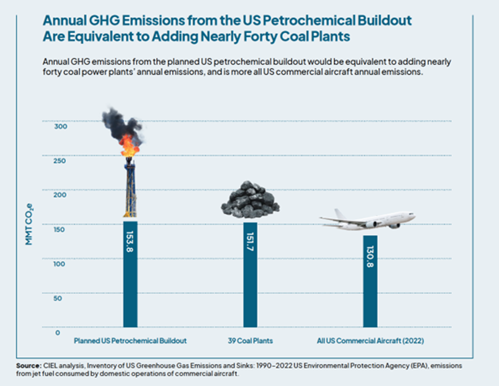 According to a new Center for International Environmental Law analysis, planned petrochemical projects across the U.S. could add a staggering 153.8 million metric tonnes of carbon dioxide-equivalent (CO₂e) emissions annually. This is equal to the emissions of nearly 40 coal power plants or all U.S. domestic commercial aviation emissions. The implications for climate change are dire, with the petrochemical sector set to become an even larger contributor to the country’s greenhouse gas (GHG) emissions.