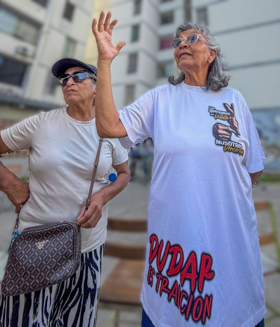 A member of Grandparents of the Homeland greets a solidarity brigade to Ciudad Tiuna, Venezuela.