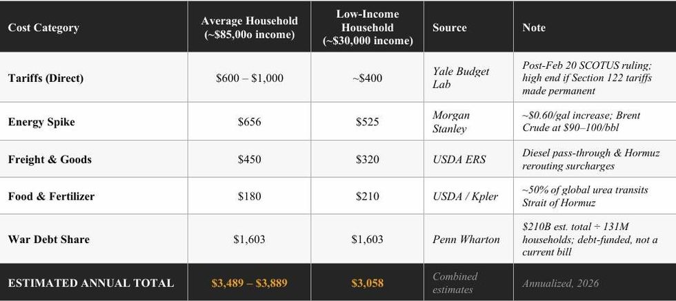 **Note: All figures are estimates from independent research institutions. Actual household impact will vary based on income, geography, spending patterns, and the duration and resolution of the Iran conflict. These estimates will be revised as the situation evolves.