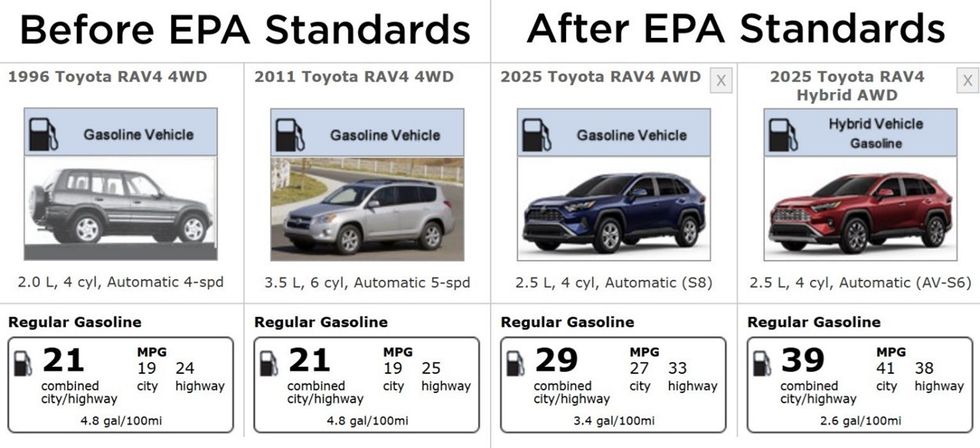 The Toyota RAV4 is the best-selling SUV in the U.S. Before EPA standards, it went 15 years with essentially zero improvement in fuel economy or emissions. Thanks to EPA standards, buyers now have options that are 29-46% more efficient. These more efficient options are saving consumers hundreds of dollars at the gas pump every year while cutting emissions in half for the cleanest models. I don’t know anyone who wants to spend thousands of dollars more on gas—but that’s the path we are headed down by eliminating standards.