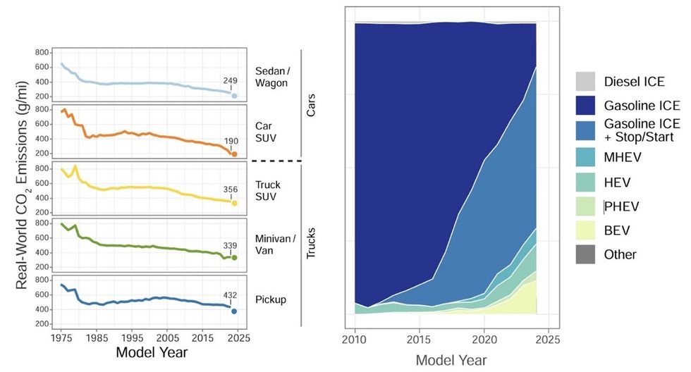 Global warming emissions from new vehicles, no matter the type of vehicle, are at record lows, largely through the use of hybrid and plug-in electric technologies deployed by manufacturers in response to EPA standards, exactly the technologies that this administration is now attacking.