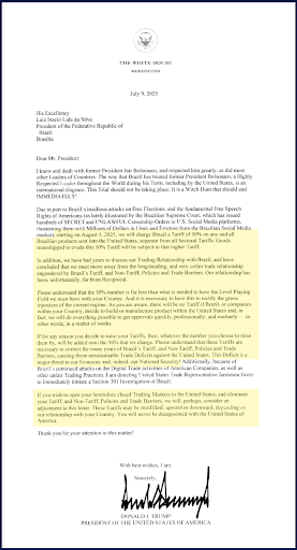 On July 9, 2025, President Donald Trump announced that the U.S. would impose tariffs of 50% on all imports from Brazil. In line with the latest round of tariffs announced over the past few days, these tariffs are to take effect on August 1, 2025.