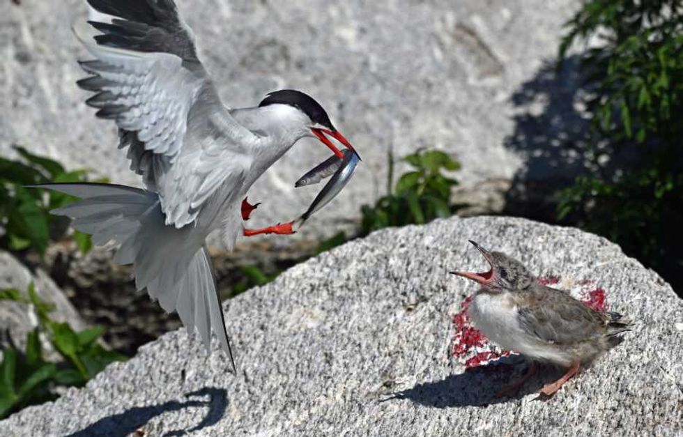 A tern delivers a fine meal of sand lance to a chick. (Photo by Derrick Jackson)