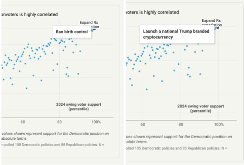 But the problem with this analysis is that there isn’t a coherent trend among the hundred-plus policies the report polled. Some policies with similarly low support include “increase police funding” and “end all government benefits for undocumented immigrants.” Meanwhile, expanding Medicare coverage polls above 90%, a policy that, elsewhere in the report, the authors imply is unpopular and untenable. (Perplexingly, the survey also records near-universal approval for “ban birth control” and “launch a national Trump-branded cryptocurrency.” Surely the authors don’t think Democrats should run on those planks.)
