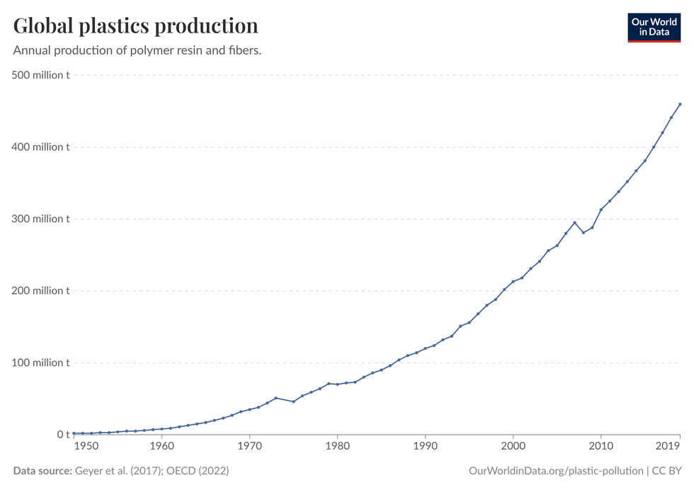 World plastics production exploded over the intervening decades, from about 25 million metric tons in 1967 to roughly 450 million in 2024. The stock prices of plastics manufacturers soared as the industry expanded, capitalizing on research into new kinds of (and ways of using) synthetic, polymer-based materials. Seemingly endless varieties of vinyl, polystyrene, acrylic, and polyurethane could be extruded, injection-molded, pressed, or spun into a blizzard of products with a stunning array of desirable properties—including durability, disposability, flexibility, hardness, insulative properties, heat resistance, and tensile strength. Plastic was cheap and it could take on any shape or color. It was a magic material that could do almost anything. Soon it was everywhere: in toys, packaging, fabrics, paints, building supplies, medical devices, car interiors, electronics, and more.
