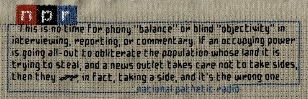 When it comes to cheerleading for Zionism—and blithely supporting a full-blown genocide to boot—The New York Times is the consensus champion. In the past two years, Palestine supporters have blasted the old paper harder than ever for spreading pro-Israel propaganda with its reporting, for the smug callousness of its opinion writers, and for passive-voice headlines giving the impression that the source of Palestinians' endless suffering is a mystery. Here, though, I'll leave monitoring of the Times to the pros and focus instead on many liberals' favorite "objective" news source, the beleaguered National Public Radio.