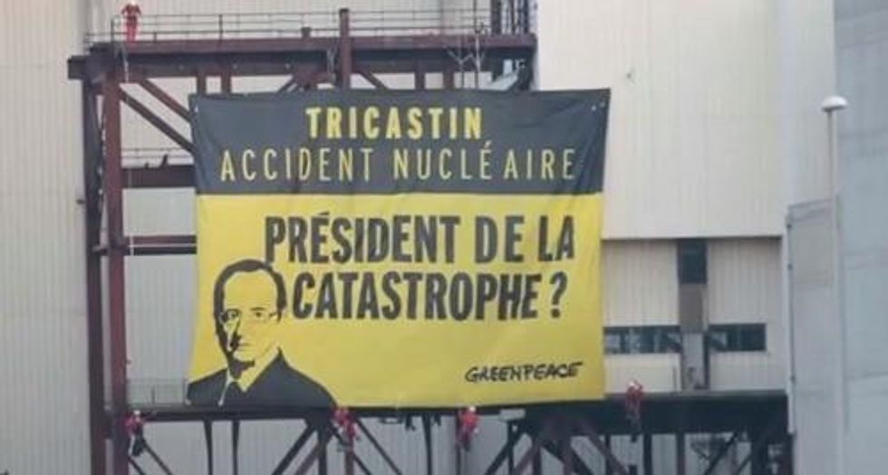 In the pre-dawn action on Monday, the activists climbed fences at the Tricastin nuclear power plant run by Electricite de France (EDF) where they unfurled banners and projected "Tricastin Nuclear Accident" and showed an image of President Francois Hollande's face next to the words "President of the Catastrophe?" and "Ready to Pay the Price?"