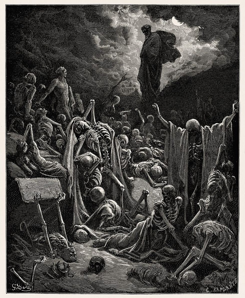 A devotee of literalism would sneer at the assertion, “So, you’re saying, an acrid valley strewn with sun-bleached skeletal remains, upon hearing the voice of God, was restored then rose as an army of flesh? Have you over-indulged in edibles? How can you pretend that is even possible?”