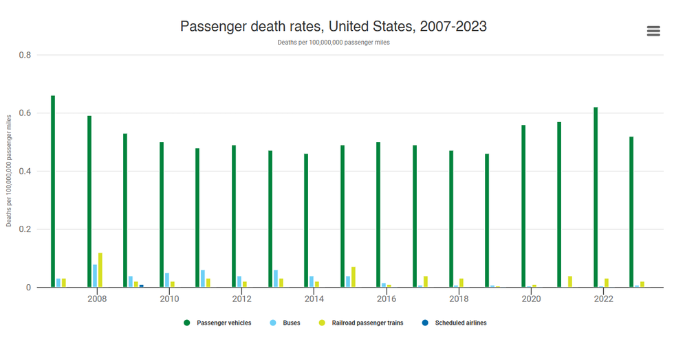 However, data show that between 2007 and 2023, deaths from automobile accidents were 100 times more likely than deaths on buses and 20 times more likely than on passenger trains.