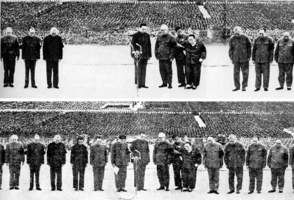 Only weeks earlier, hundreds of millions of Chinese and other readers around the world had seen photographs in the Chinese communist newspaper, the People’s Daily, and other official media showing all four sitting in the front row of mourners at Mao’s funeral. After they were arrested, Chinese publications continued to carry those photos—but with Jiang and her three allies, now labeled the “Gang of Four,” airbrushed out. The editing was anything but subtle: Blurred smudges or blank spots appeared where they had been in the originals, while their names in the captions were blotted out by vertical rows of X’s.