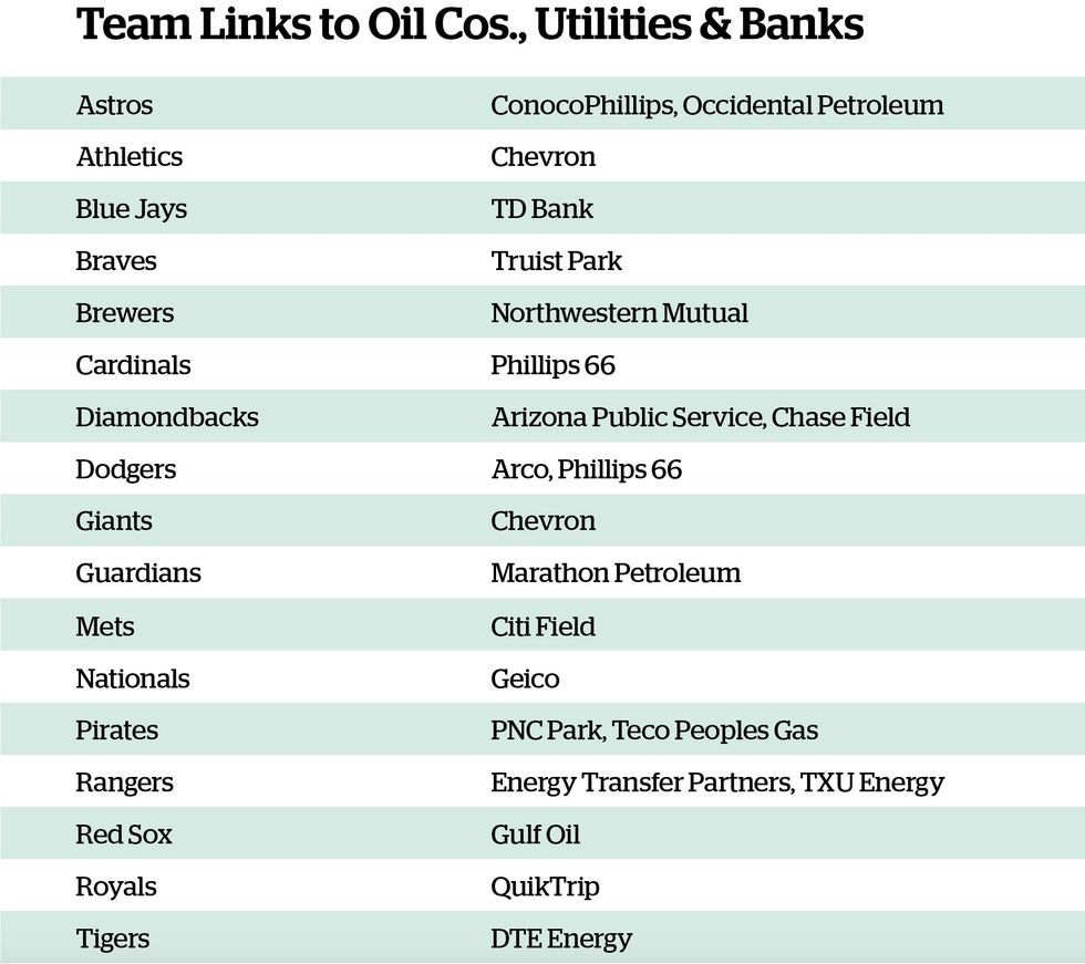 Six of the 12 MLB teams in this year’s playoffs—including the league champions—are sponsored by some of the biggest polluters on the planet as well the financial institutions that underwrite them.